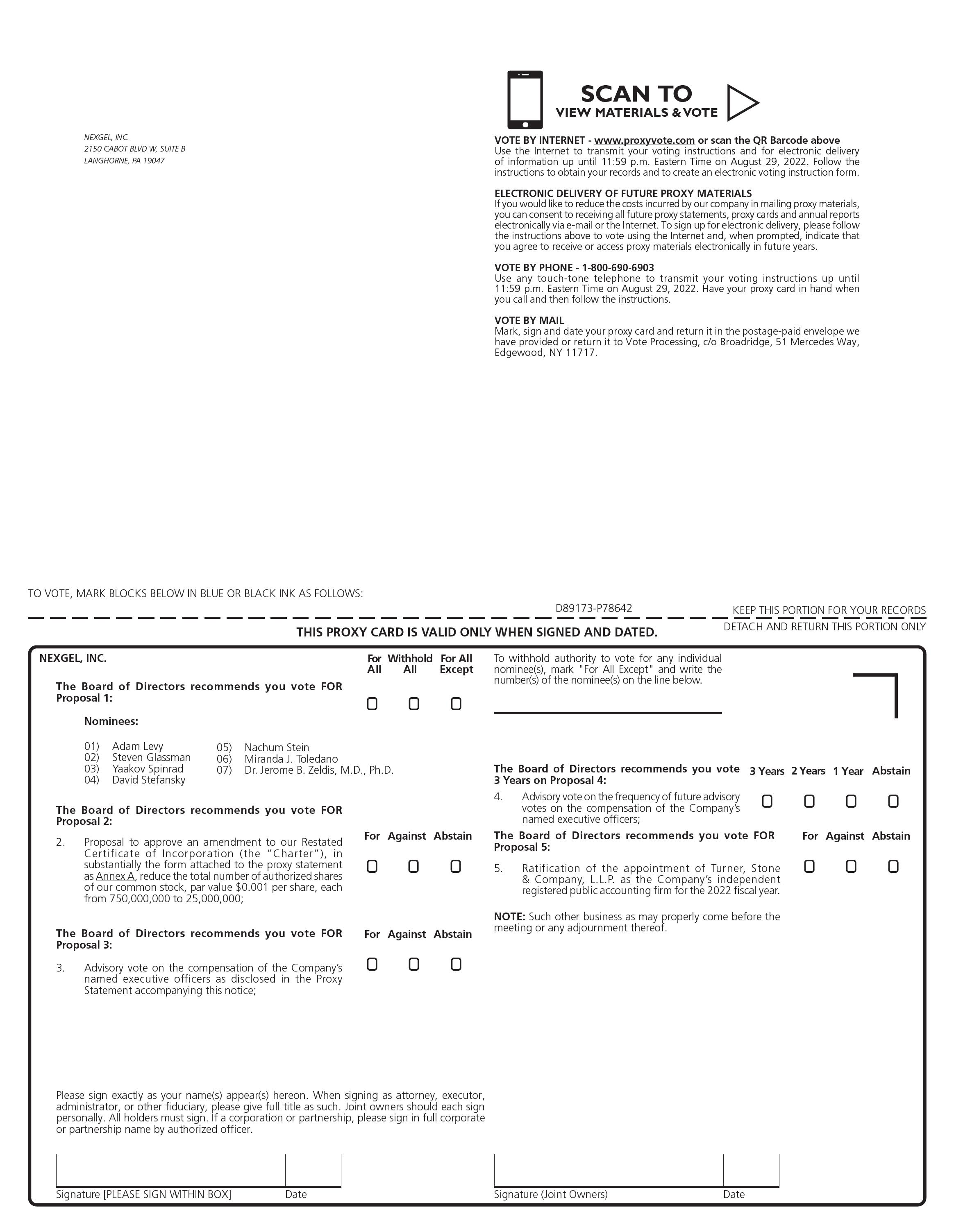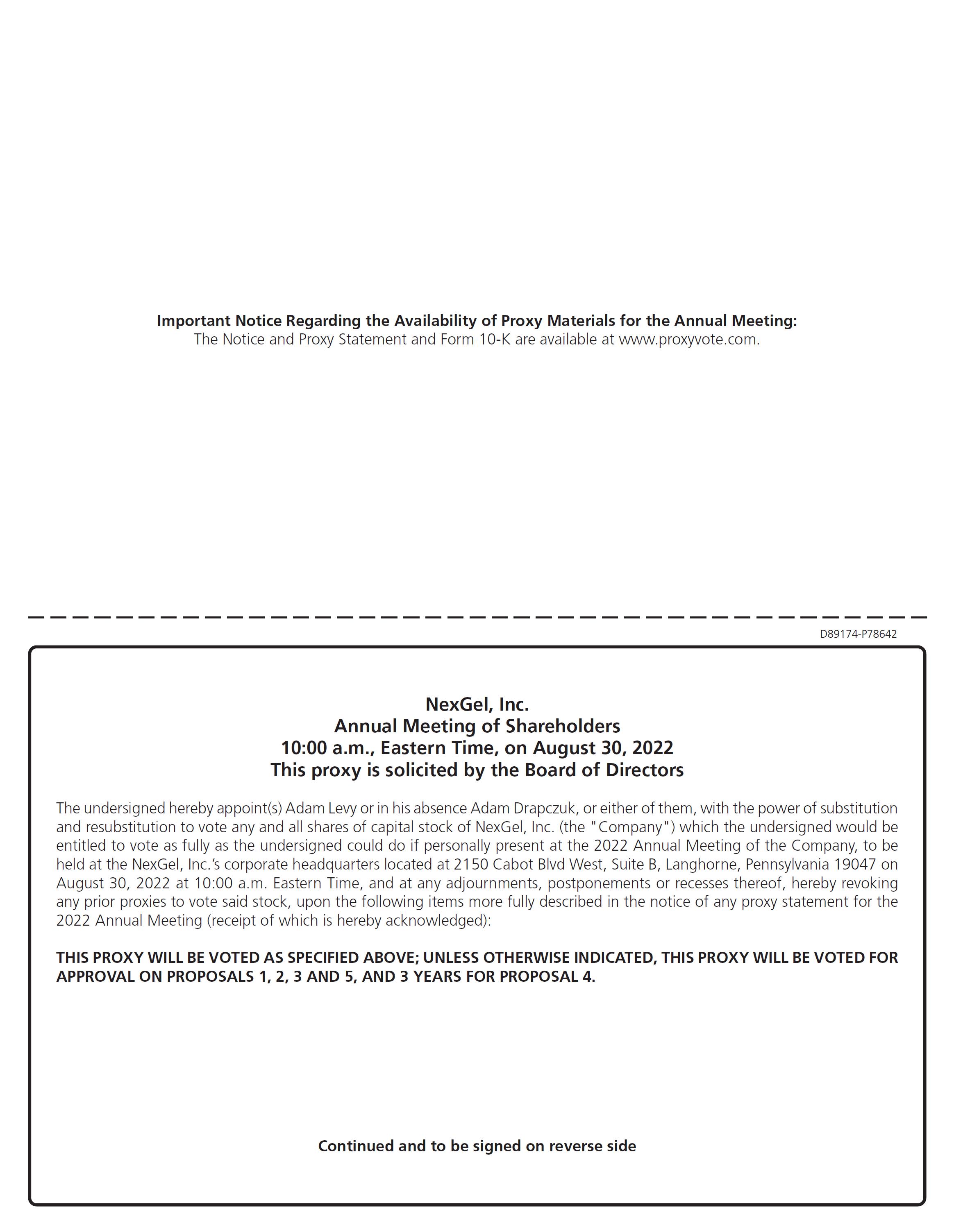 You are cordially invited to attend the Annual Meeting of Stockholders of NexGel, Inc. to be held at 10:00 a.m., Eastern Time, on August 30, 2022, at our corporate headquarters located at 2150 Cabot Blvd West, Suite B, Langhorne, Pennsylvania 19047.