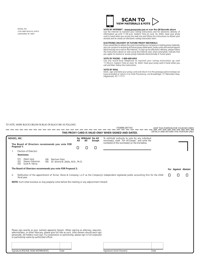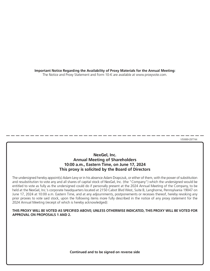 You are cordially invited to attend the Annual Meeting of Stockholders of NexGel, Inc. to be held at 10:00 a.m., Eastern Time, on June 17, 2024, at our corporate headquarters located at 2150 Cabot Blvd West, Suite B, Langhorne, Pennsylvania 19047.